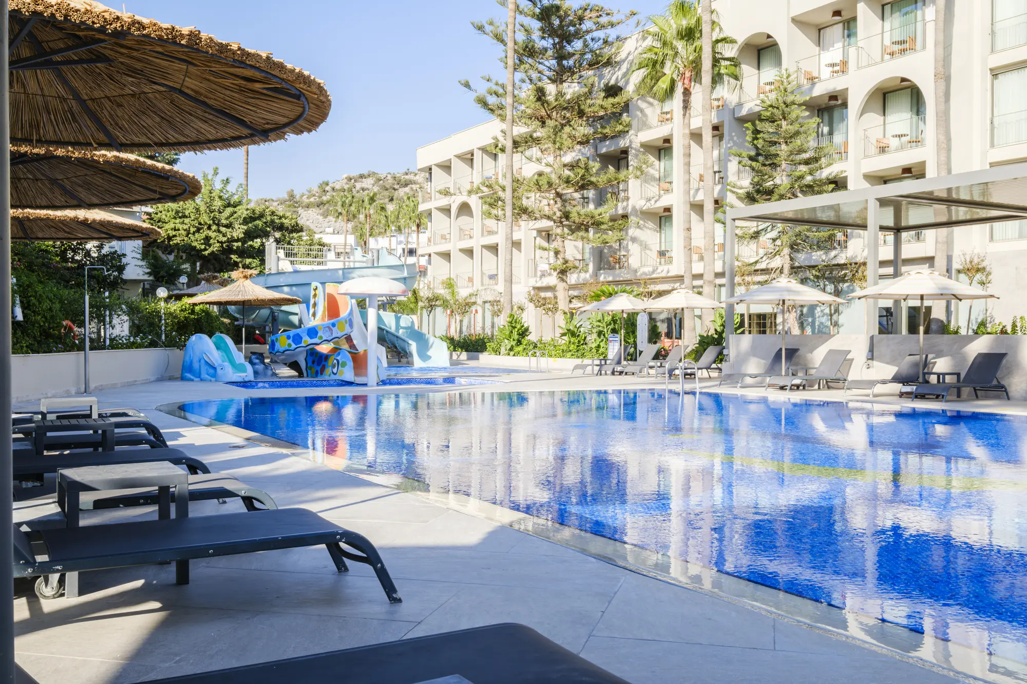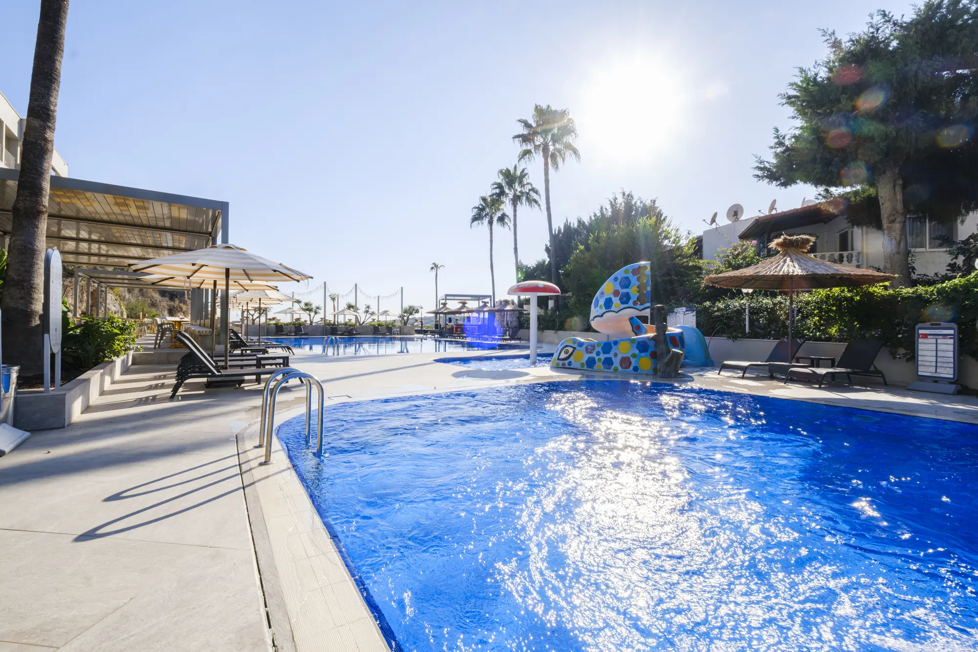 Mavi bayraklı plajımız, özel iskelemiz, aqua parkımız, açık ve kapalı yüzme havuzlarımız ile gün boyu eğlencenin tadını çıkarın. Konforunuz için her detayın düşünüldüğü bu özel konsept ile unutulmaz bir tatil sizi bekliyor!
