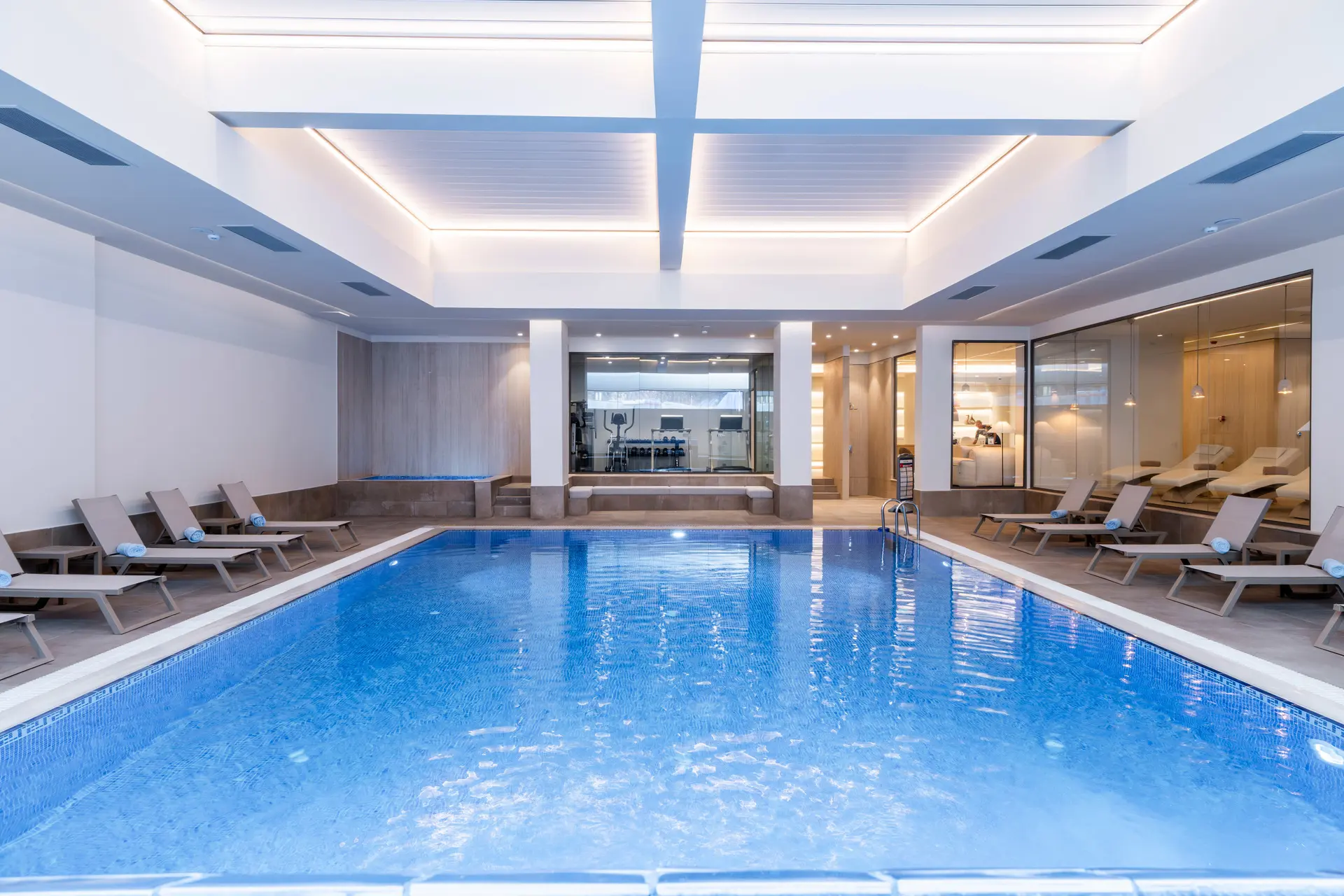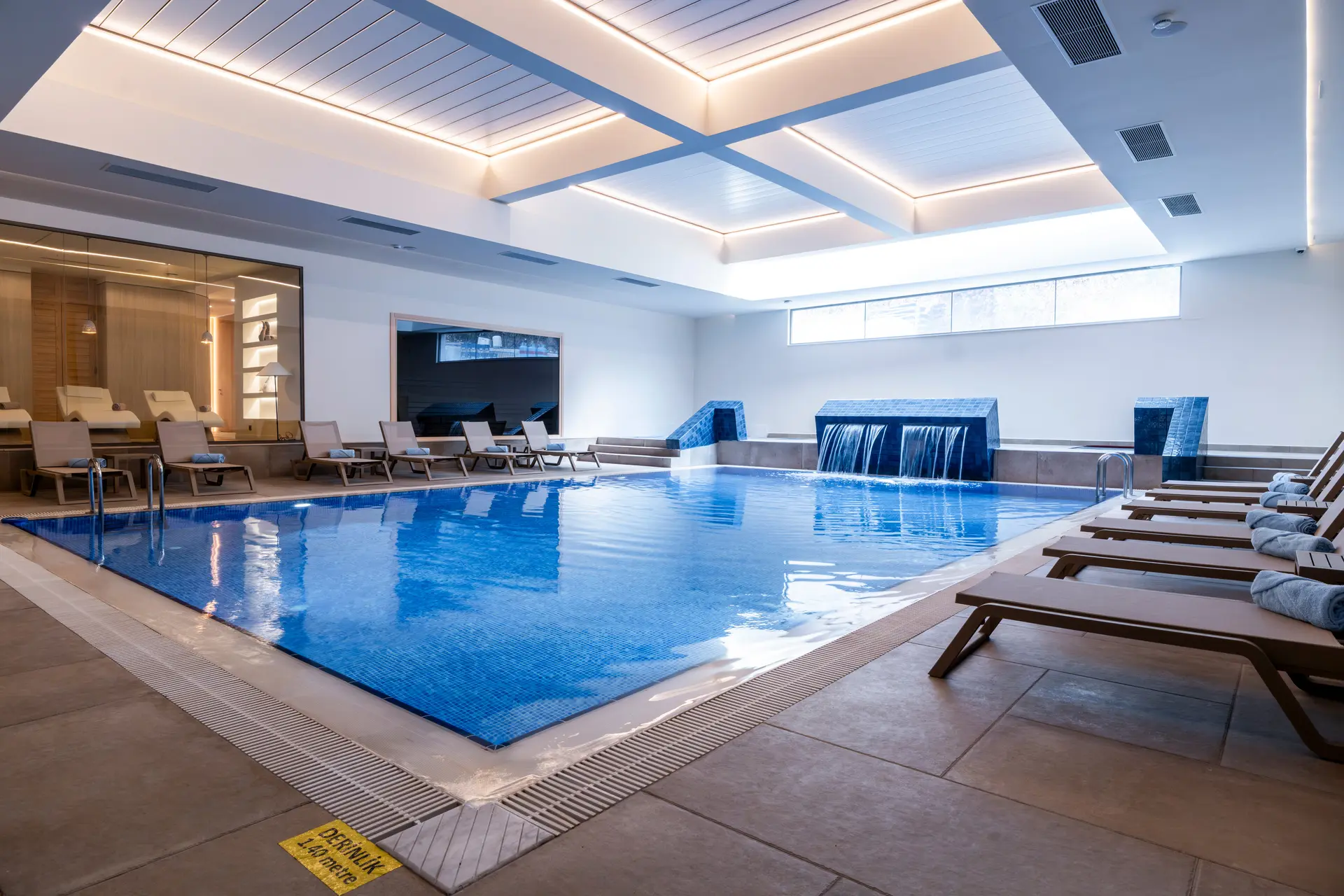 Her mevsim konforlu bir yüzme deneyimi sunan kapalı havuzumuz, zarif mimarisi ve ferah ortamıyla öne çıkıyor. İster güne enerjik bir başlangıç yapın, ister günün yorgunluğunu suyun içinde bırakın… Tüm yıl boyunca keyifle kullanabileceğiniz bu alan, hem dinlenmek hem de formda kalmak isteyen misafirlerimiz için ideal bir durak.